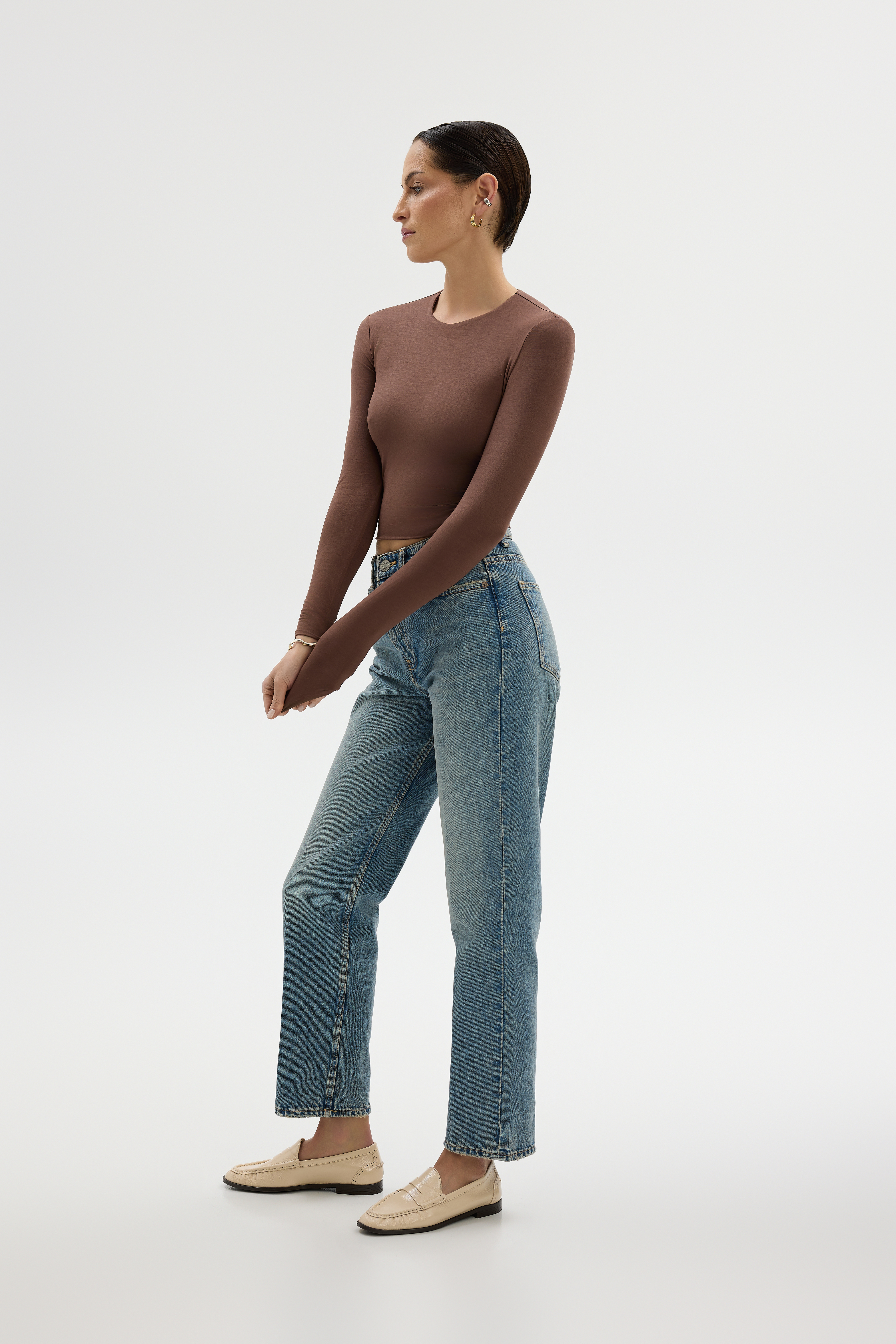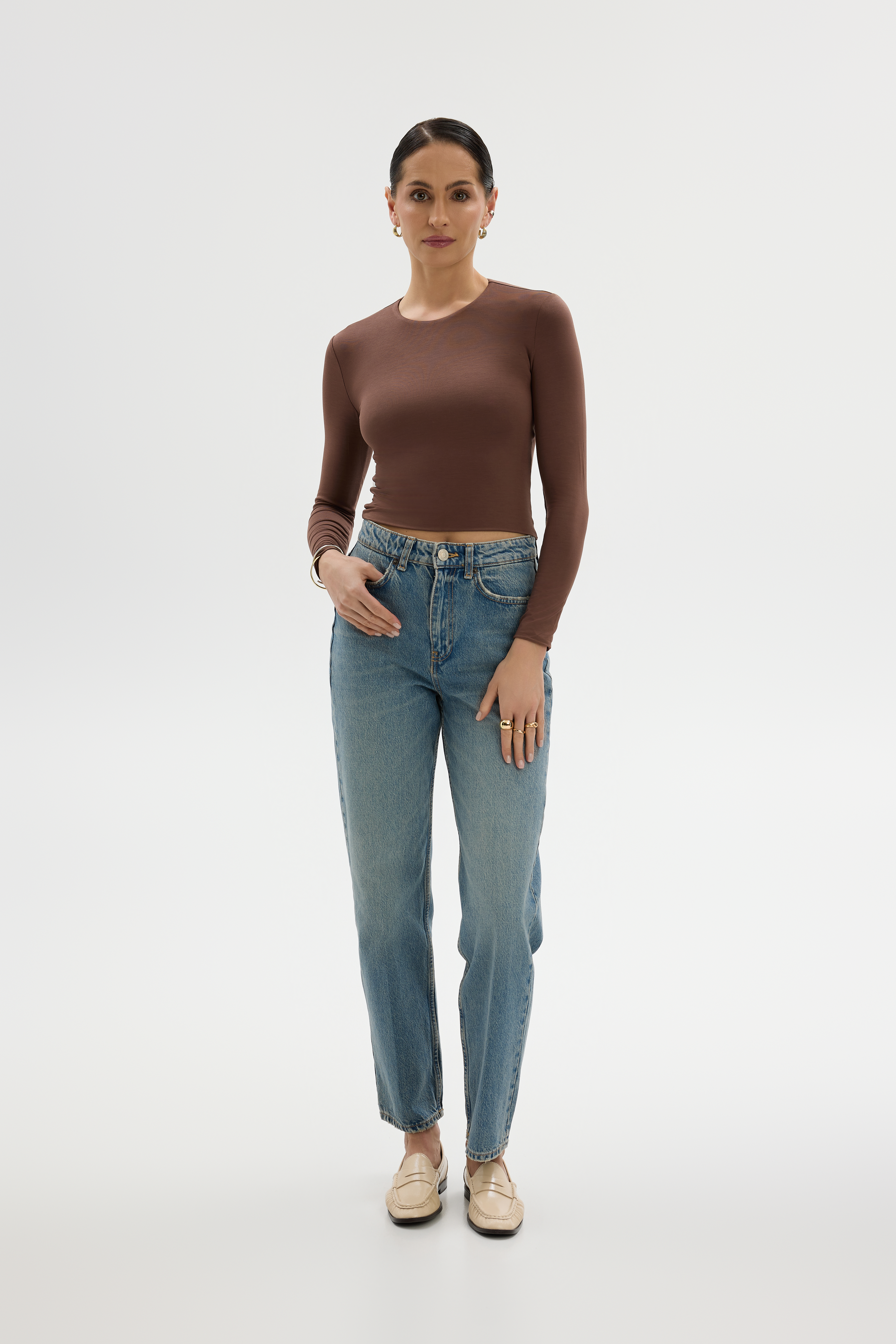 Klasyczny, krótki, brązowy crop top pod szyję z okrągłym dekoltem. Ponadczasowy i prosty krój. Podwójna warstwa dzianiny, bezszwowe wykończenie, elastyczne nici zapewniają wysoki komfort noszenia. Świetnie komponuje się ze spodniami o podwyższonym stanie.