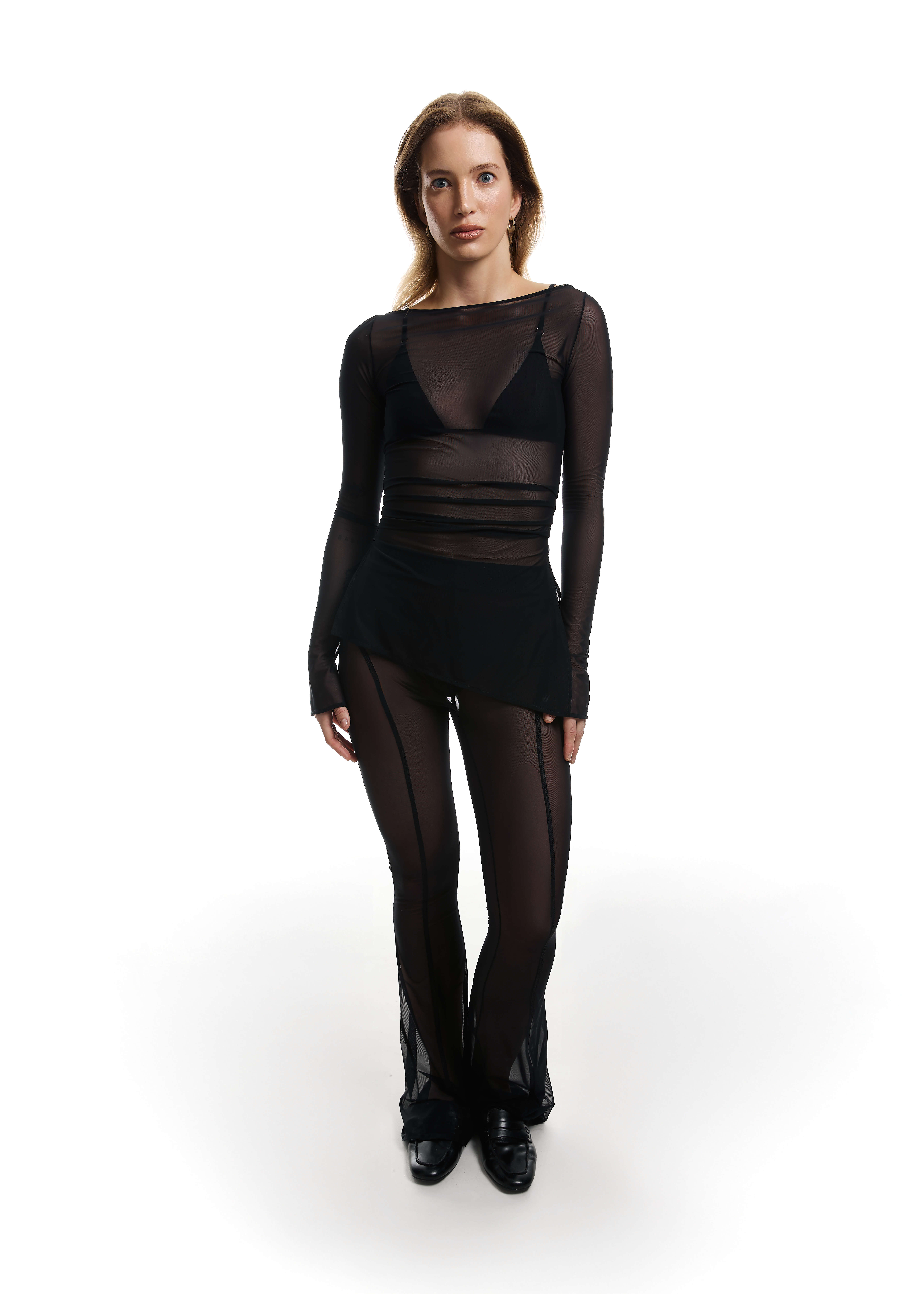 Transparent mesh pants that accentuate the silhouette and add a bold, feminine touch to any outfit. Made of soft, stretchy mesh made of recycled polyester, they fit perfectly to the body and subtly reveal the legs. Vertical stitching optically slenderizes the legs, and a delicate elastic waistband ensures comfortable wear. The model has a fitted cut and is finished with the utmost attention to detail. Wear them in layers - the pants are the perfect base for many styles, put on an oversize t-shirt / shirt, and over it a jacket and enjoy a timeless styling - sensual, modern, conscious.