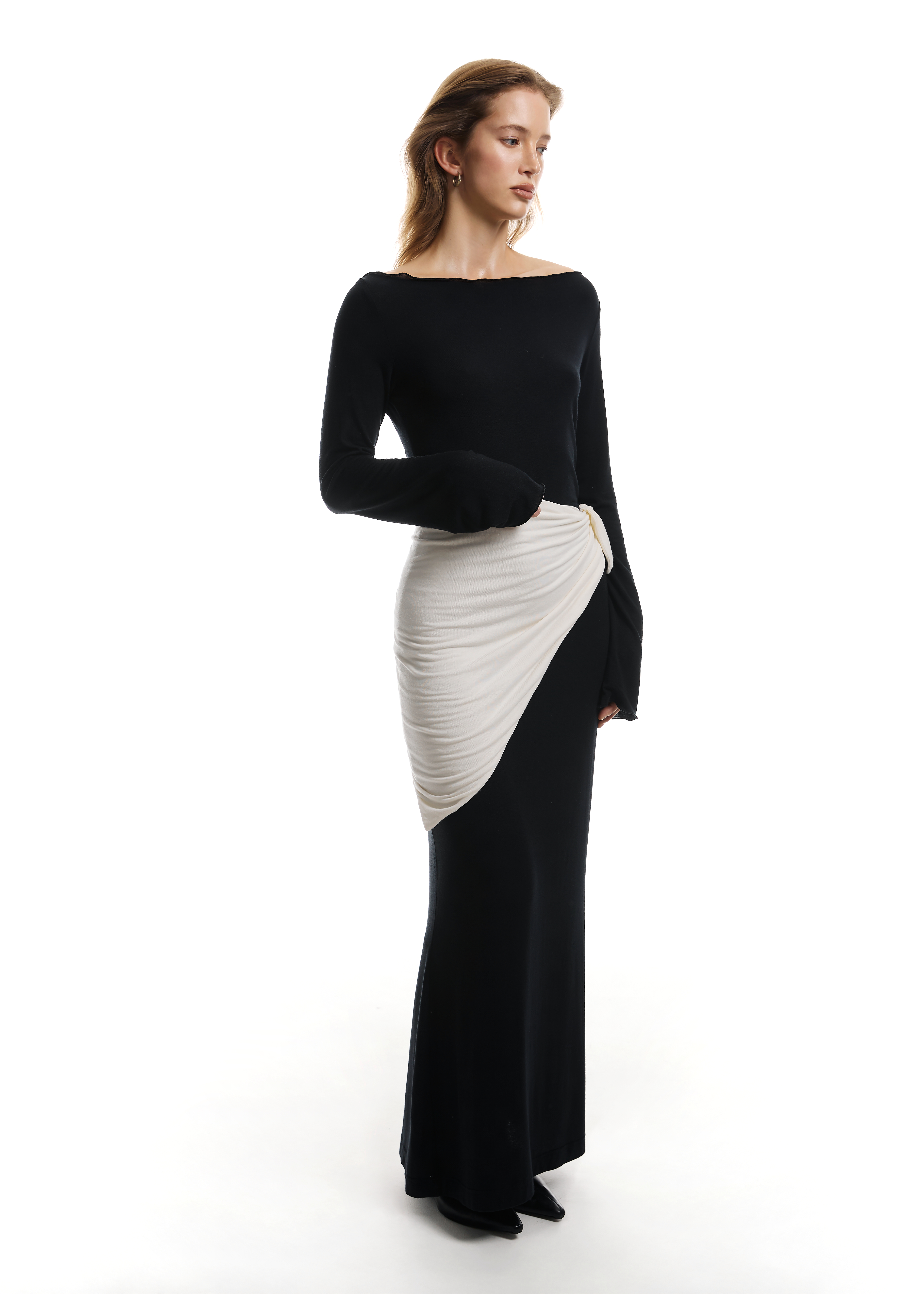 Cashmere-infused maxi mesh dress combines comfort, sensuality and subtle elegance. The long line of the dress, the flared sleeves and the split neckline create a sophisticated but distinctive whole. This is a model that emphasizes individuality and attracts attention without unnecessary embellishments. It beautifully emphasizes the silhouette, while remaining a light and comfortable choice for cooler days. Thin, stretchy material gently wraps the body, ensuring freedom of movement. Made in Poland with attention to every detail. This is a model that will go well with your favorite cowboy boots and scarf. Thanks to the admixture of cashmere, the material gains a unique softness and luxurious touch, which stands out against classic fabrics.
