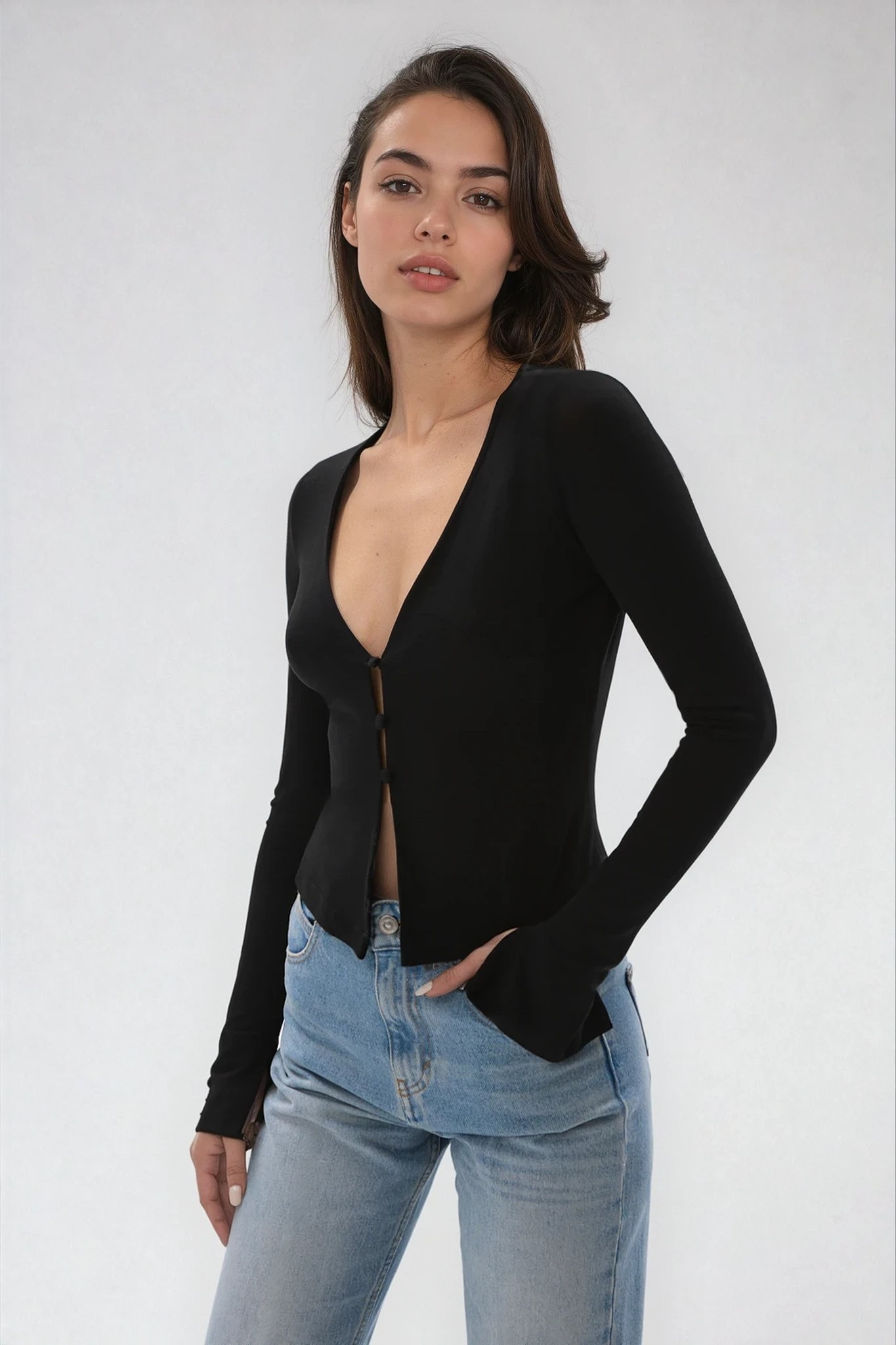 A black button-down sweater with a timeless cut is the perfect choice for any occasion. The delicate buttons on the front add a classic charm, while the subtle slits at the ends of the sleeves introduce a touch of modernity. It is a perfect match for our leggings.