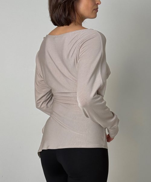Short, crop top khaki neckline with back cutout and binding for comfort. Summer release of our bestselling Crop Top product. Double layer of knit, seamless finish, elastic threads ensure high wearing comfort. Matches perfectly with a skirt with a higher waist.