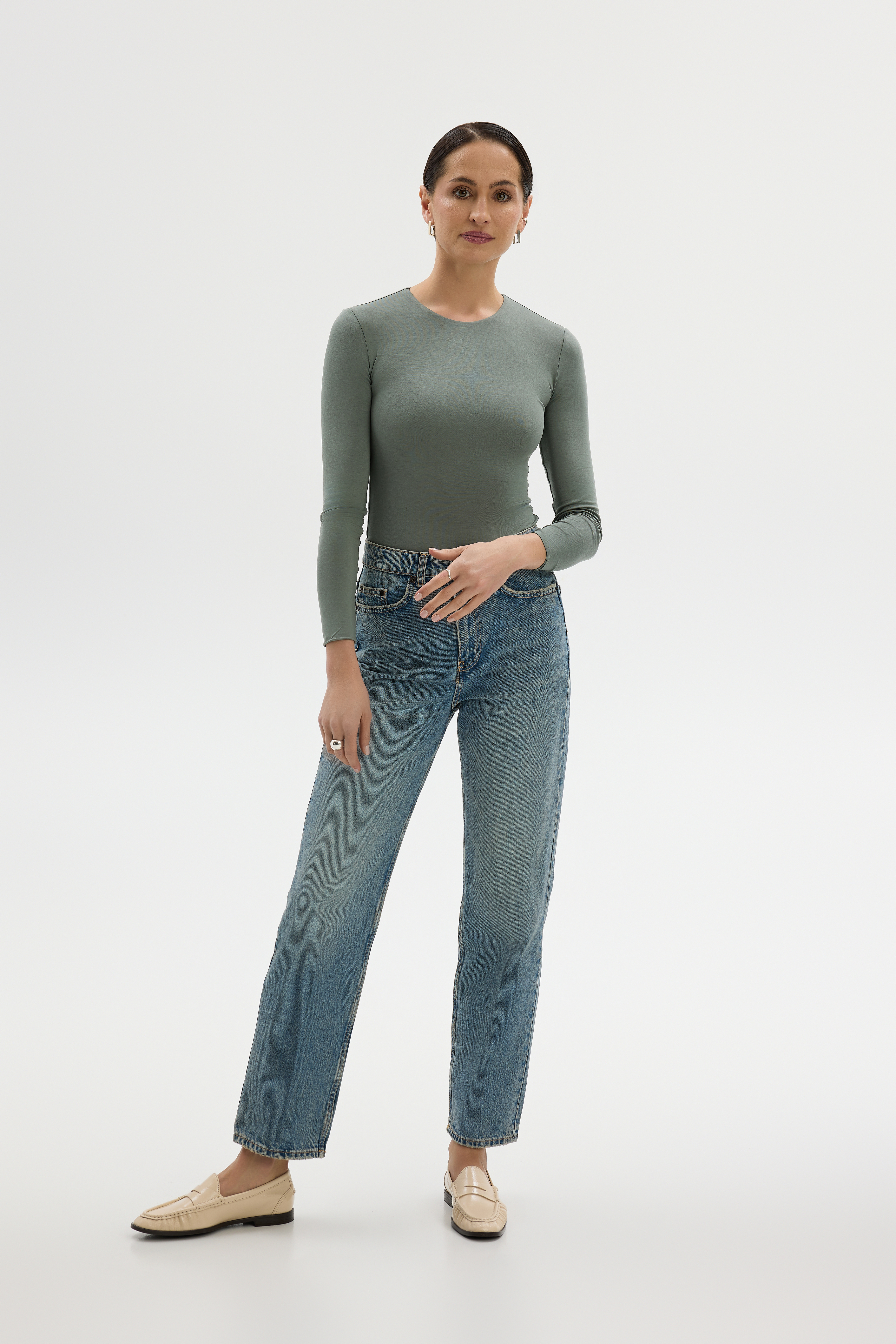 Classic neck bodysuit with round neckline. Timeless and simple cut. Double layer of knitwear, seamless finish, elastic threads ensure high wearing comfort. Fastened with delicate springs. Nickel-free.