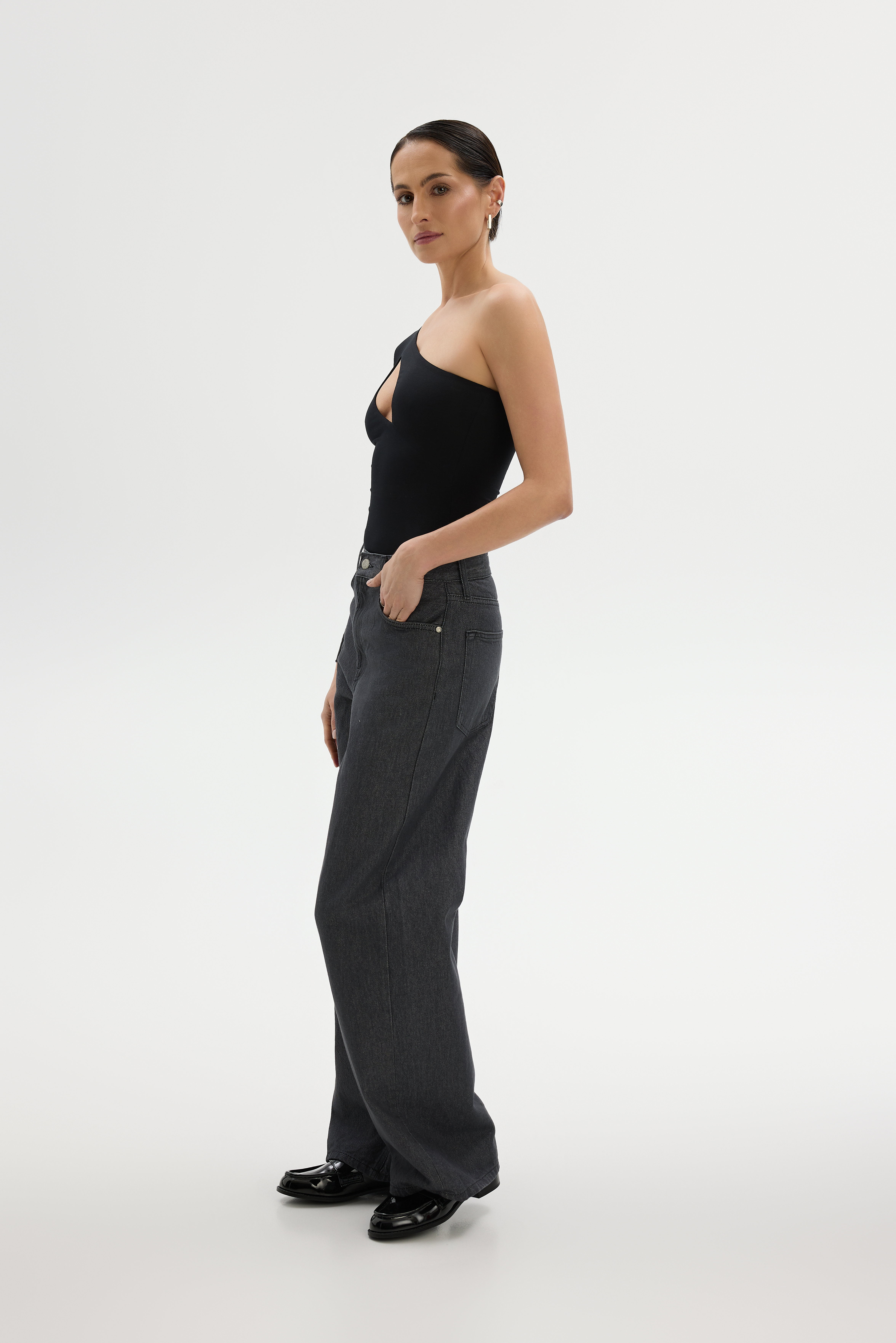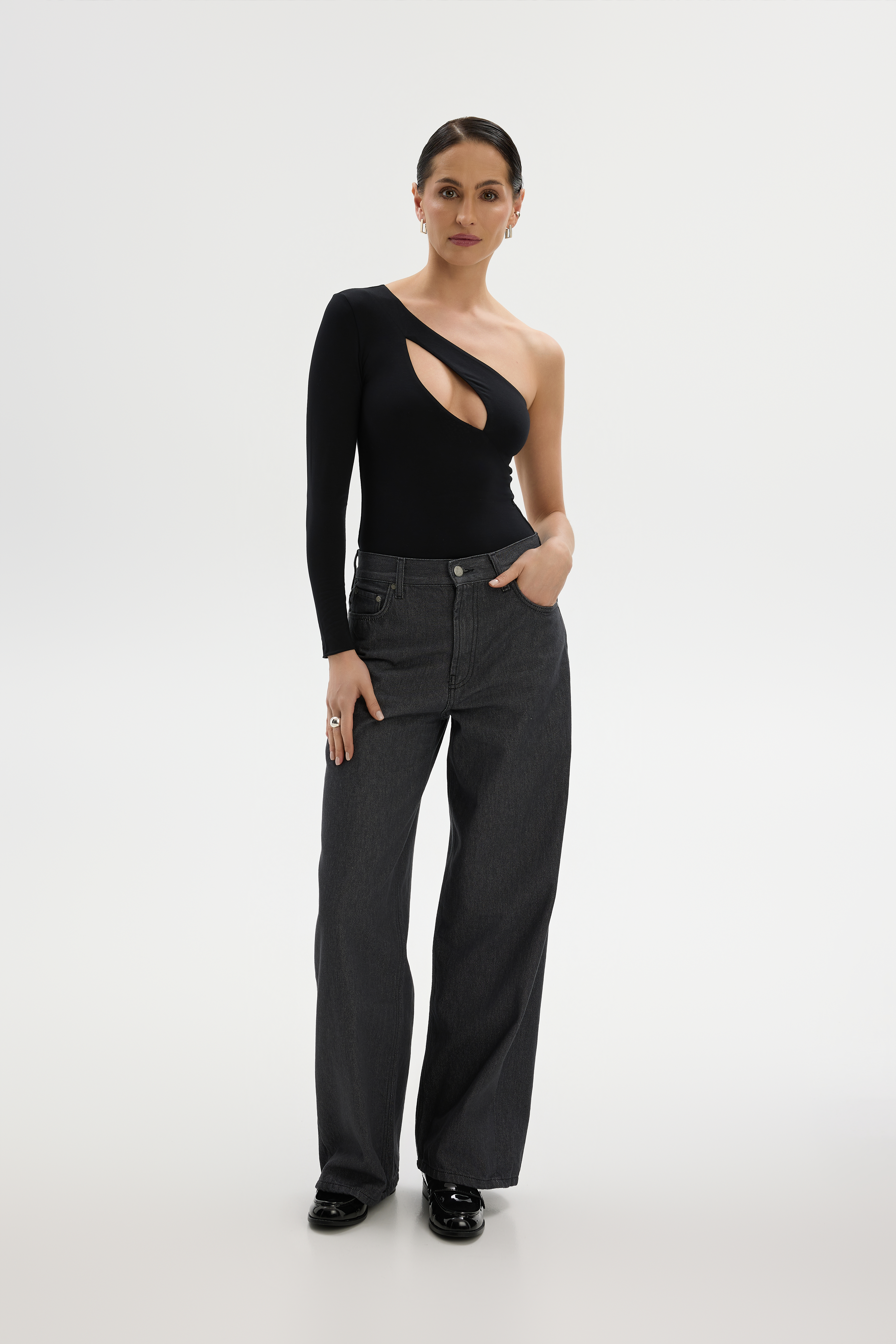 Incredibly sensual one shoulder bodysuit with long tight sleeves. The beautifully routed teardrop-shaped cut-out and exposed shoulder show off delicacy while adding a touch of spunk. The bodysuit is perfect for a date or for everyday styling. A different version of the bodysuit with a one-shoulder cut-out that is sure to pleasantly surprise its wearers. Made from a blend of viscose and elastane. The double layer of knitwear, seamless finish and elastic threads ensure a comfortable fit. Fastened with delicate springs. Nickel-free.