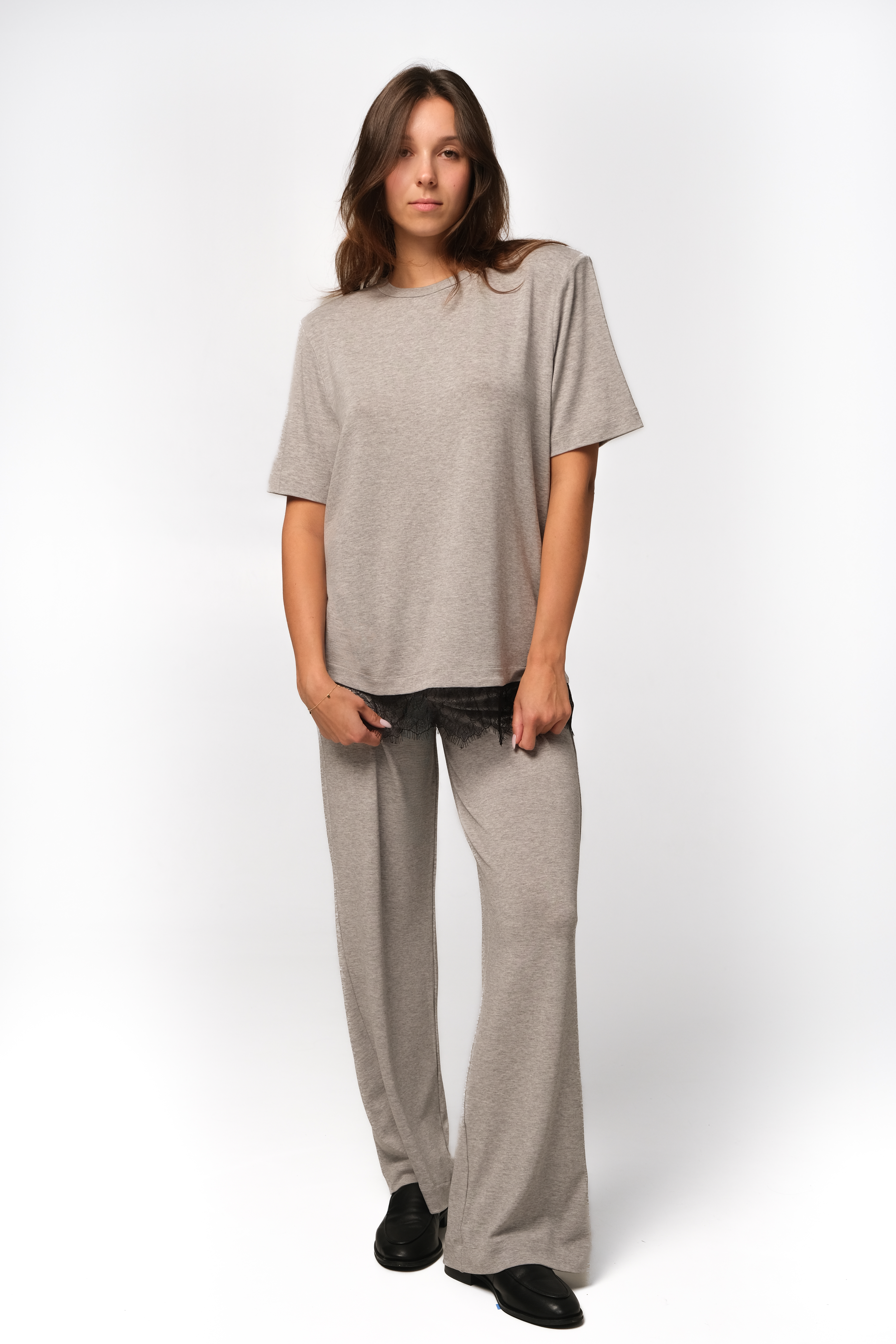 Long mid-rise trousers in grey in certified knitwear. The trousers are tied with a fabric-trimmed drawstring for a perfect fit. They are definitely defined by their comfort. The wide cut of the trousers, which fits perfectly with sports and elegant shoes. Premium product made from a blend of Lyocell and elastane.