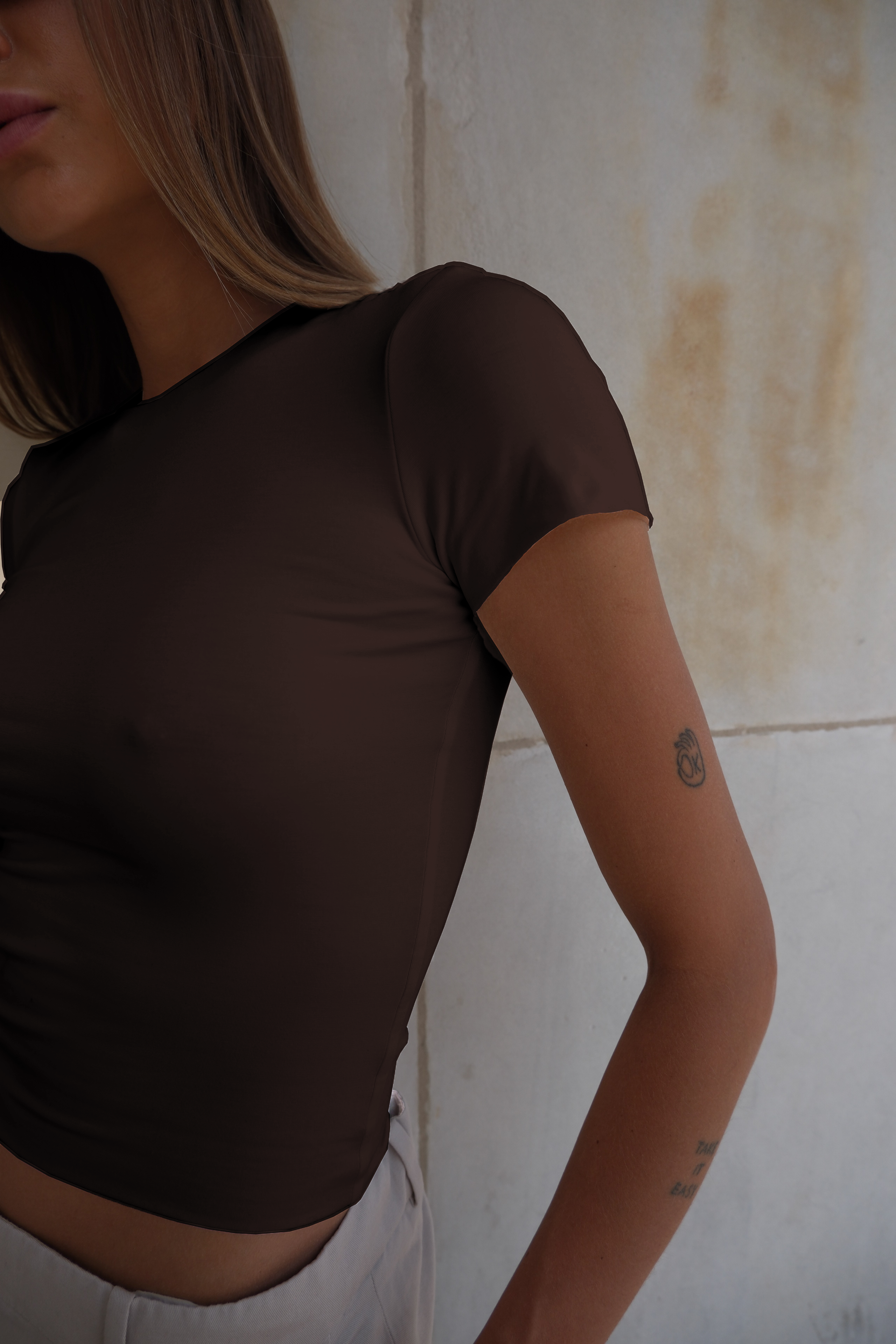 Klasyczny, krótki top pod szyję w kolorze intensywnego brązu z okrągłym dekoltem. Ponadczasowy i prosty krój. Podwójna warstwa dzianiny, bezszwowe wykończenie, elastyczne nici zapewniają wysoki komfort noszenia. Świetnie łączy się ze spodniami z wysokim stanem i bez wątpienia ten top z krótkim rękawem to absolutny must have tego lata.