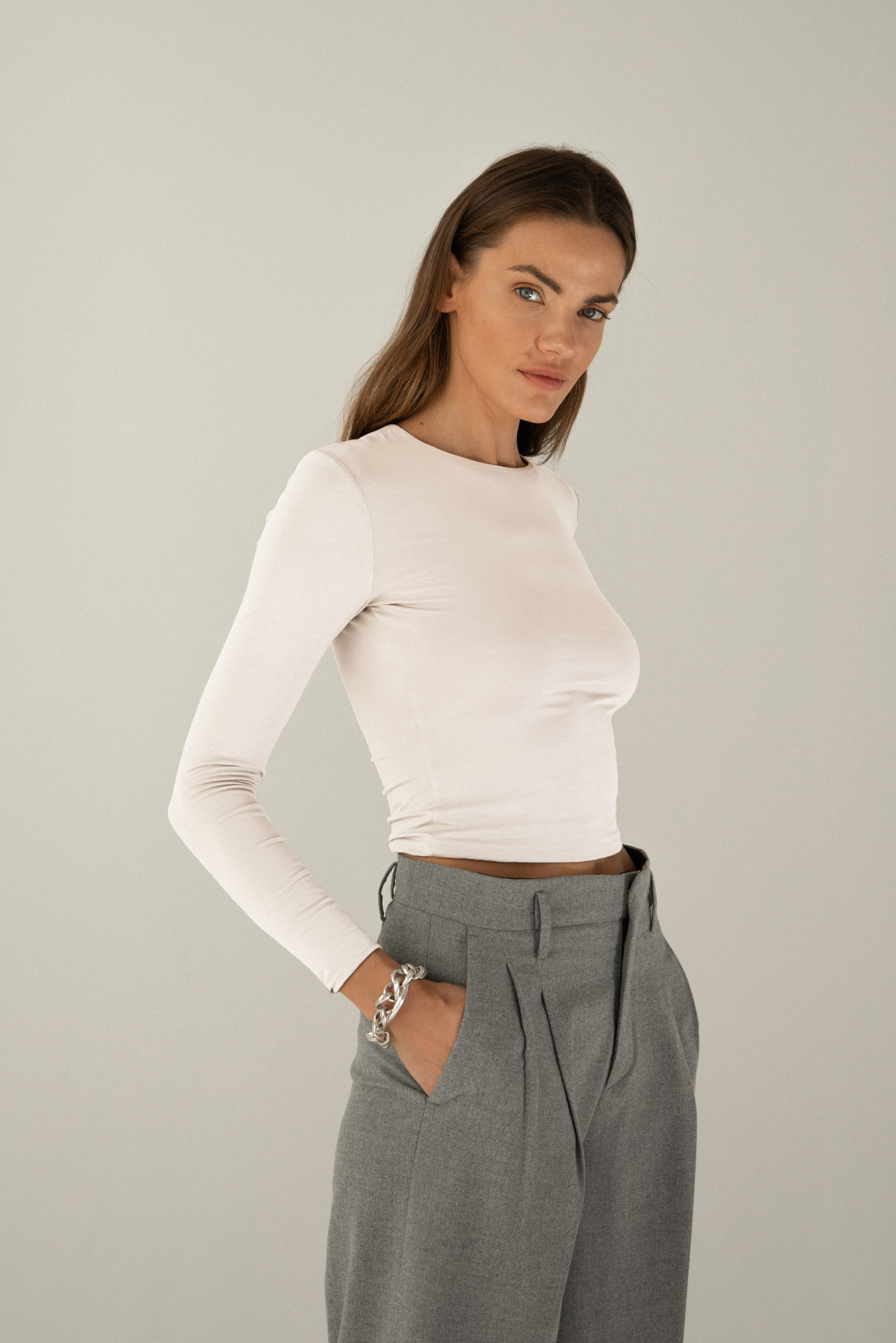 Класичний кроп-топ кольору екрю з круглим вирізом тепер доступний у подовженому варіанті. Довжина кроп-топа збільшена на 2 см, завдяки чому він сягає лінії стегон. Позачасовий і простий крій. Потрійний шар трикотажу, безшовна обробка та еластичні нитки забезпечують високий рівень комфорту при носінні. Колір екрю. Крій добре поєднується з брюками із завищеною талією.
