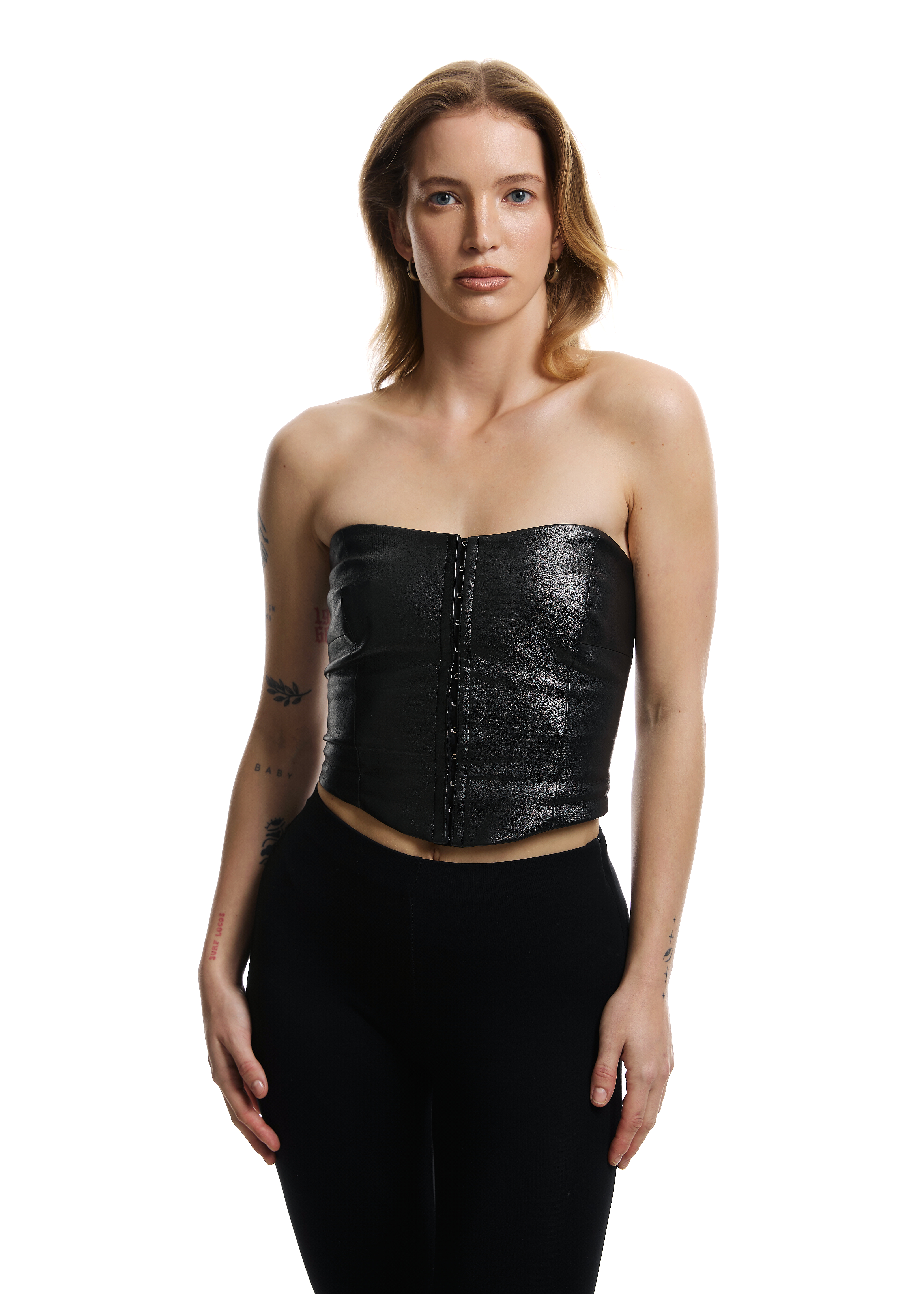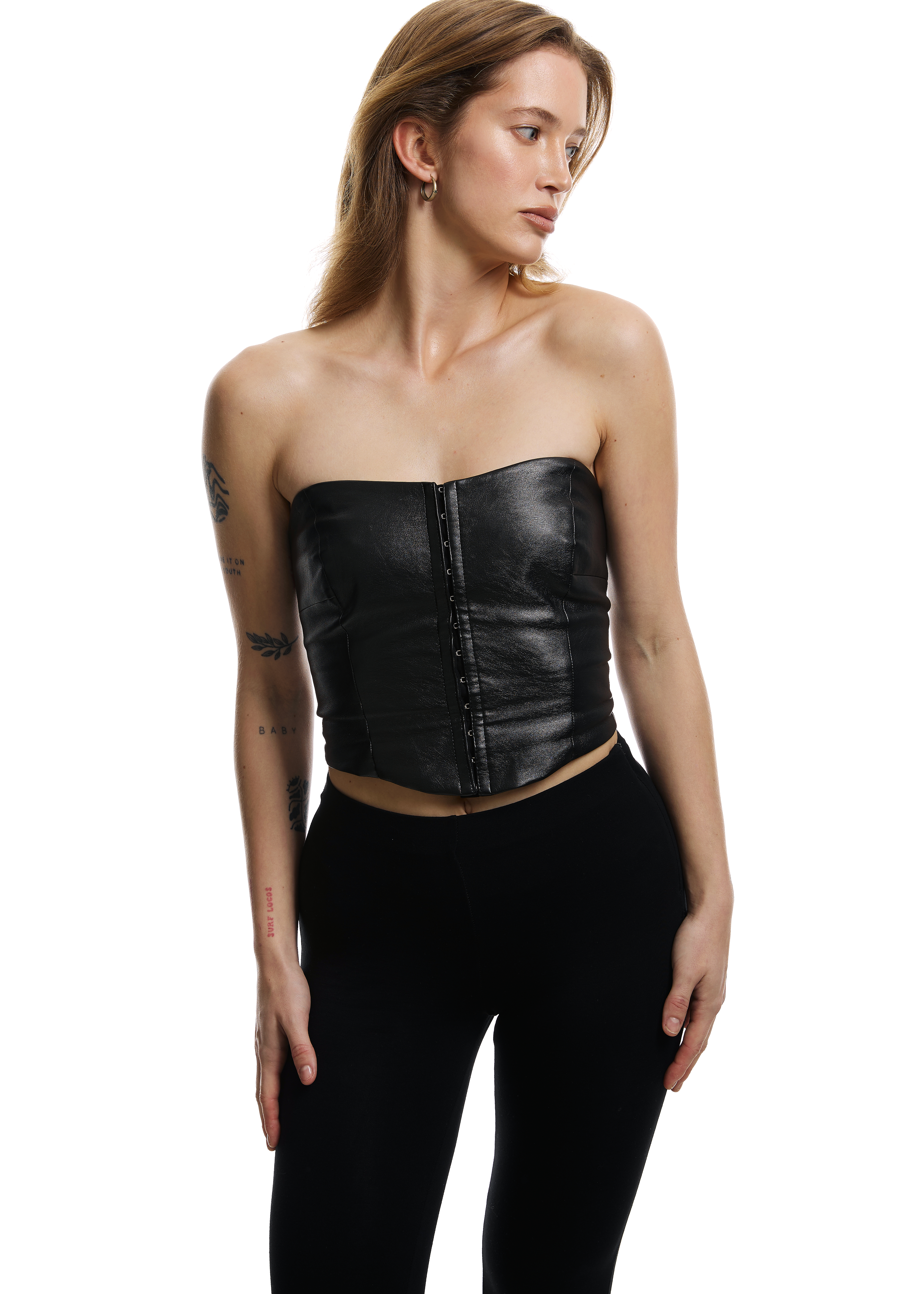 Корсет на гачках з веганської шкіри чорного відтінку - функціональний варіант з вишуканим стилем. Він гарно підкреслює силует, а застібка на гачках дозволяє легко регулювати його, надаючи сексуальності всьому образу. Ідеальний варіант для вашої улюбленої сорочки. У парі з нашою новою спідницею завершить образ!